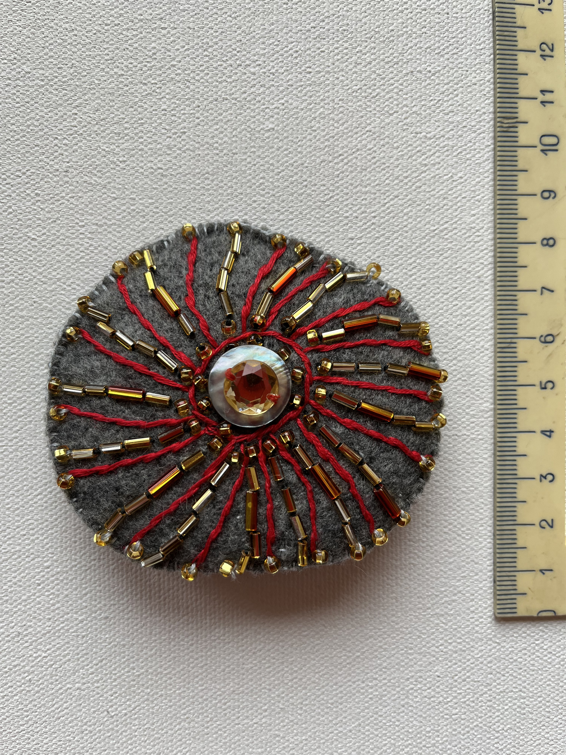 Brooch "The Sun", handmade gift, felt, glass, w. metal pin , size 80x70 mm